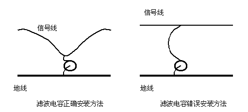 电容的谐振频率由ESL和C共同决定,电容值或电感值越大,则谐振频率越低,也就是电容的高频滤波效果越差。ESL除了与电容器的种类有关外,电容的引线长度是一个十分重要的参数,引线越长,则电感越大,电容的谐振频率越低。因此在实际工程中,要使电容器的引线尽量短,电容器的正确安装方法和不正确安装方法如图2所示。